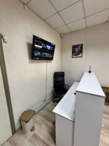 Rafturi, tejghea, TV, decor, totul pregătit pentru a activa imediat